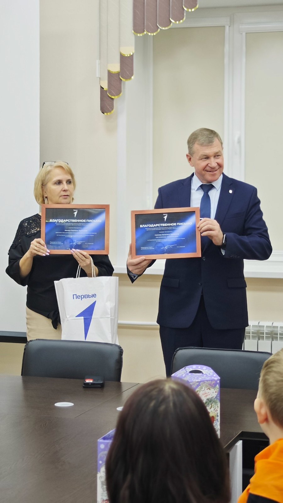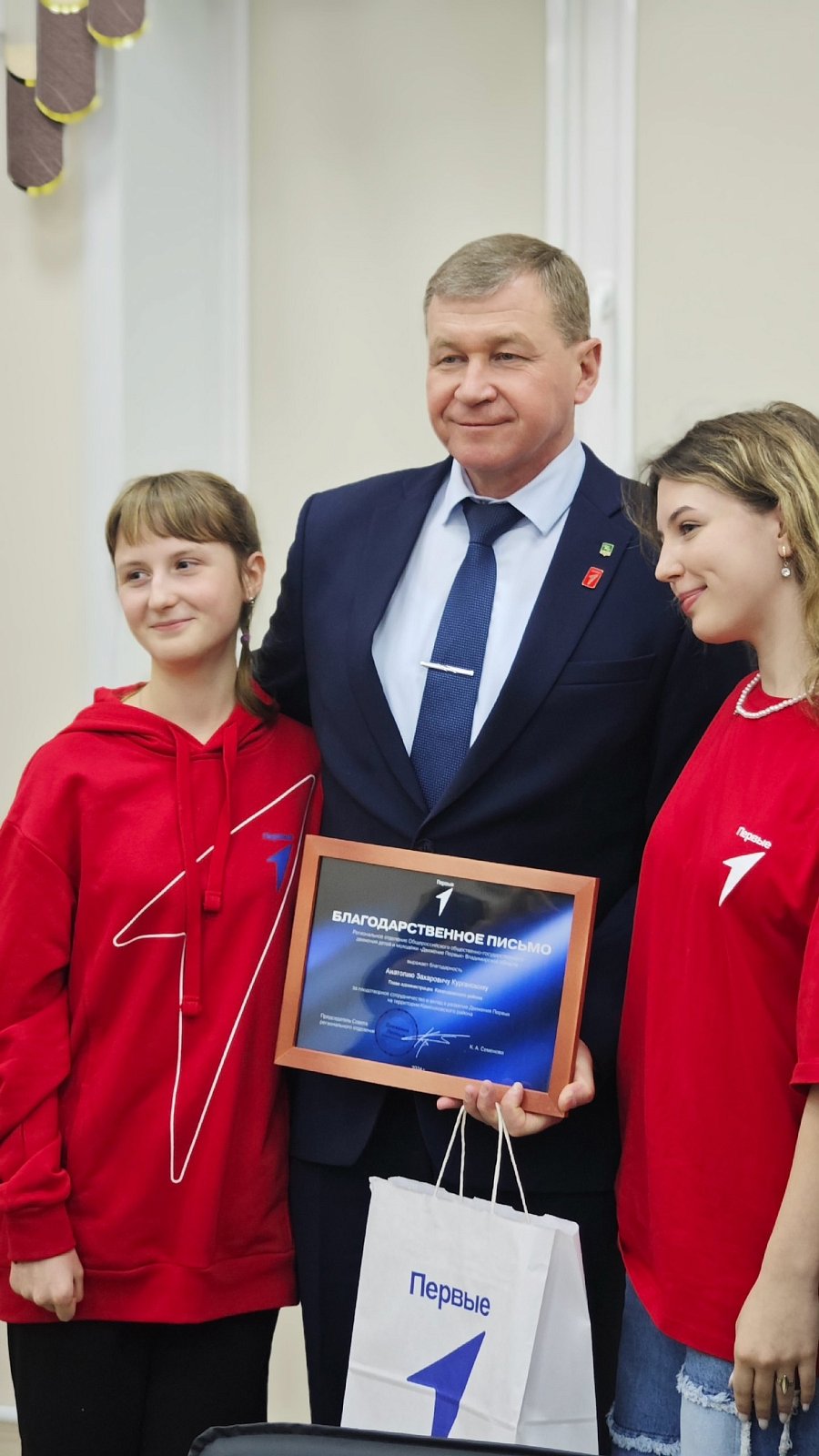 Без подарков в этот день не остался никто. Активисты "Движения первых" подарили Анатолию Захаровичу и Наталье Сергеевне памятные подарки.