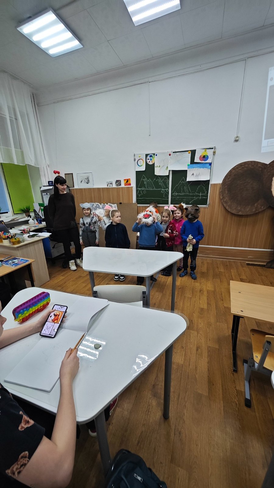 А воспитанники студии развития речи "Говоруша" познакомились с традициями при помощи интересной "Сказки-колядки". История очень увлекла юных слушателей. Они решили начать колядовать! Ребята совместно с педагогом облачились в маски и платки, отправились в гости в объединение "Арт-Мастер". Дети исполняли стихи и колядки, и, конечно, получили угощение за свои старания!
