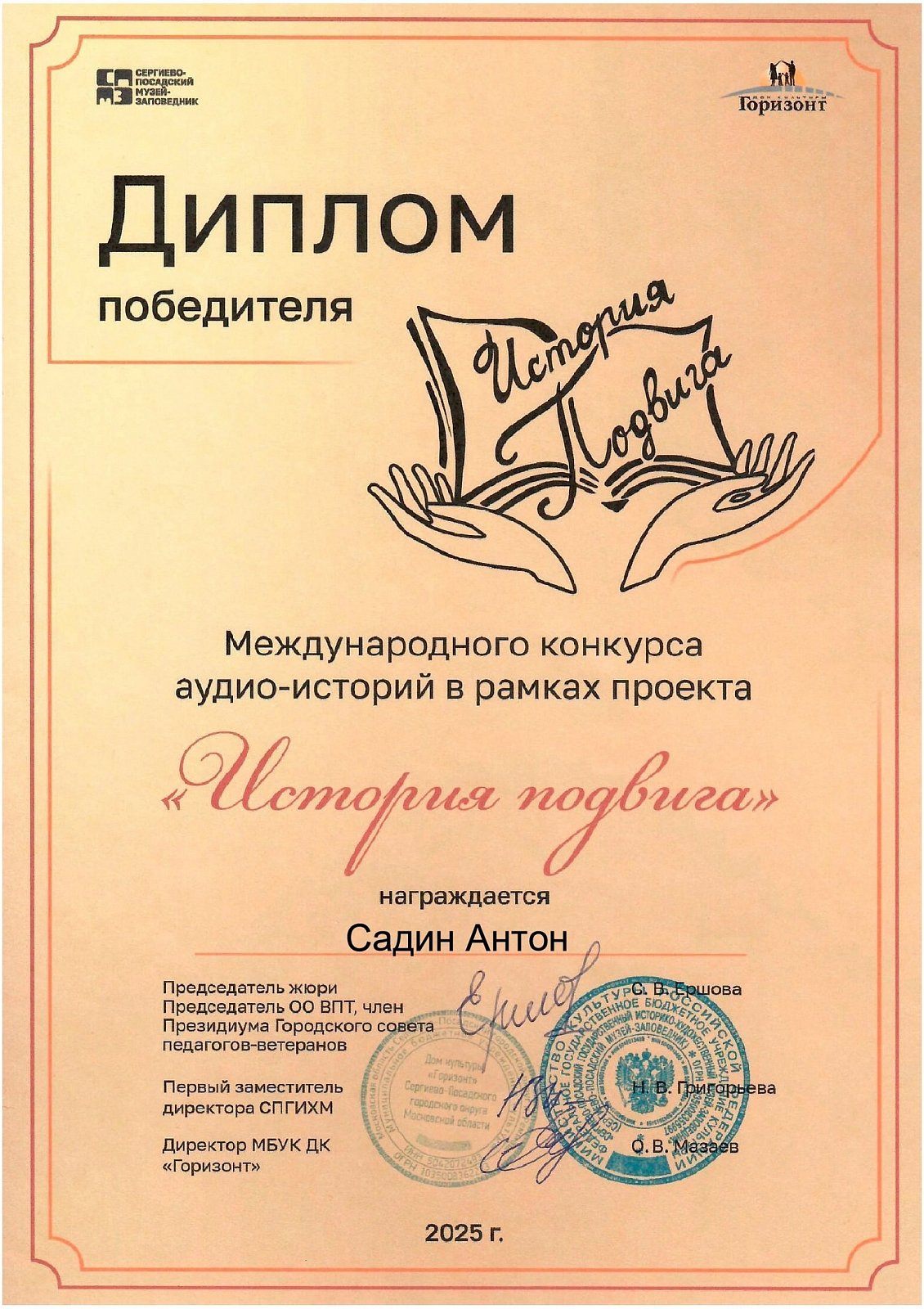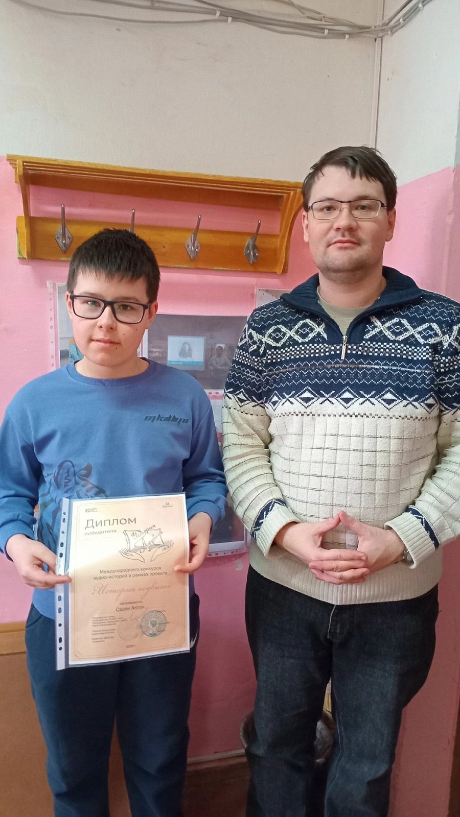 Диплом победителя у воспитанника детского объединения "Родные просёлки" Садина Антона. Он записал 4-х минутный рассказ "Ожидание длиною в жизнь" на основе истории об уроженце города Камешково, участнике Крымского фронта Сидорове Александре Тимофеевиче и его супруге Клавдии Прохоровне. В основе ее положена разлука и незатухающее чувство после гибели мужа.